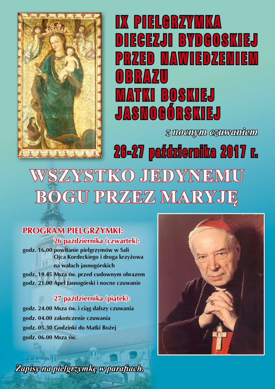 „Wszystko jedynemu Bogu przez Maryję” – to hasło IX Pielgrzymki Diecezji Bydgoskiej przed nawiedzeniem kopii obrazu Matki Boskiej Jasnogórskiej, która odbędzie się od 26 do 27 października.