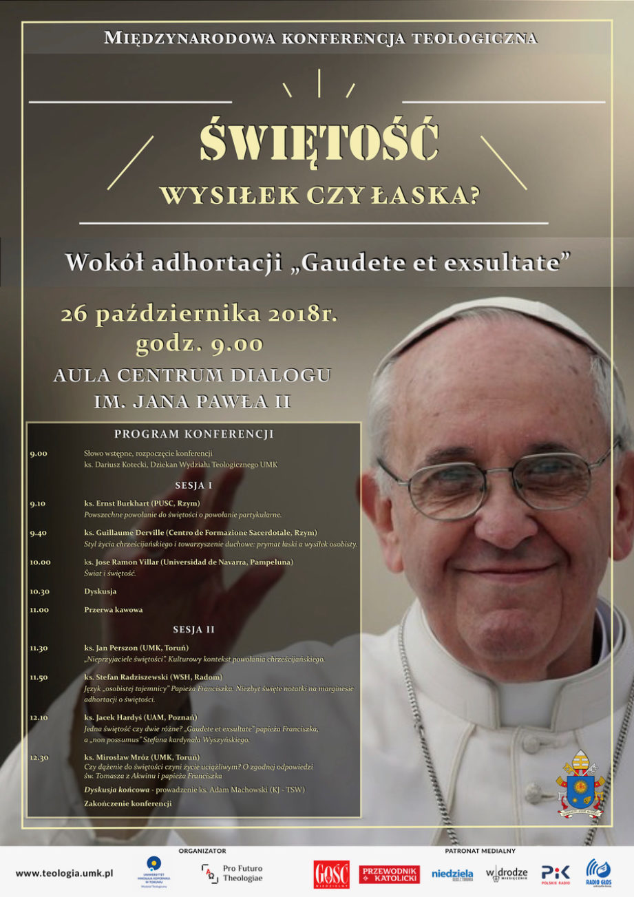 „Świętość – wysiłek czy łaska? Wokół adhortacji «Gaudete et exsultate»” – to tytuł międzynarodowej konferencji teologicznej, która odbędzie się 26 października w auli Centrum Dialogu im. Jana Pawła II w Toruniu.