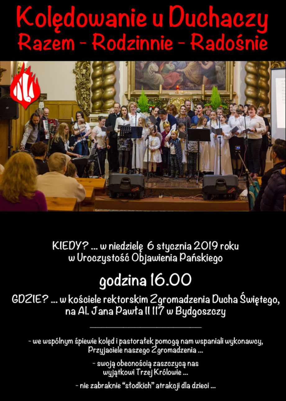 Zapraszamy na „Kolędowanie u Duchaczy”, które odbędzie się w uroczystość Objawienia Pańskiego – 6 stycznia o godz. 16 w kościele rektorskim (al. JP II 117) w Bydgoszczy.