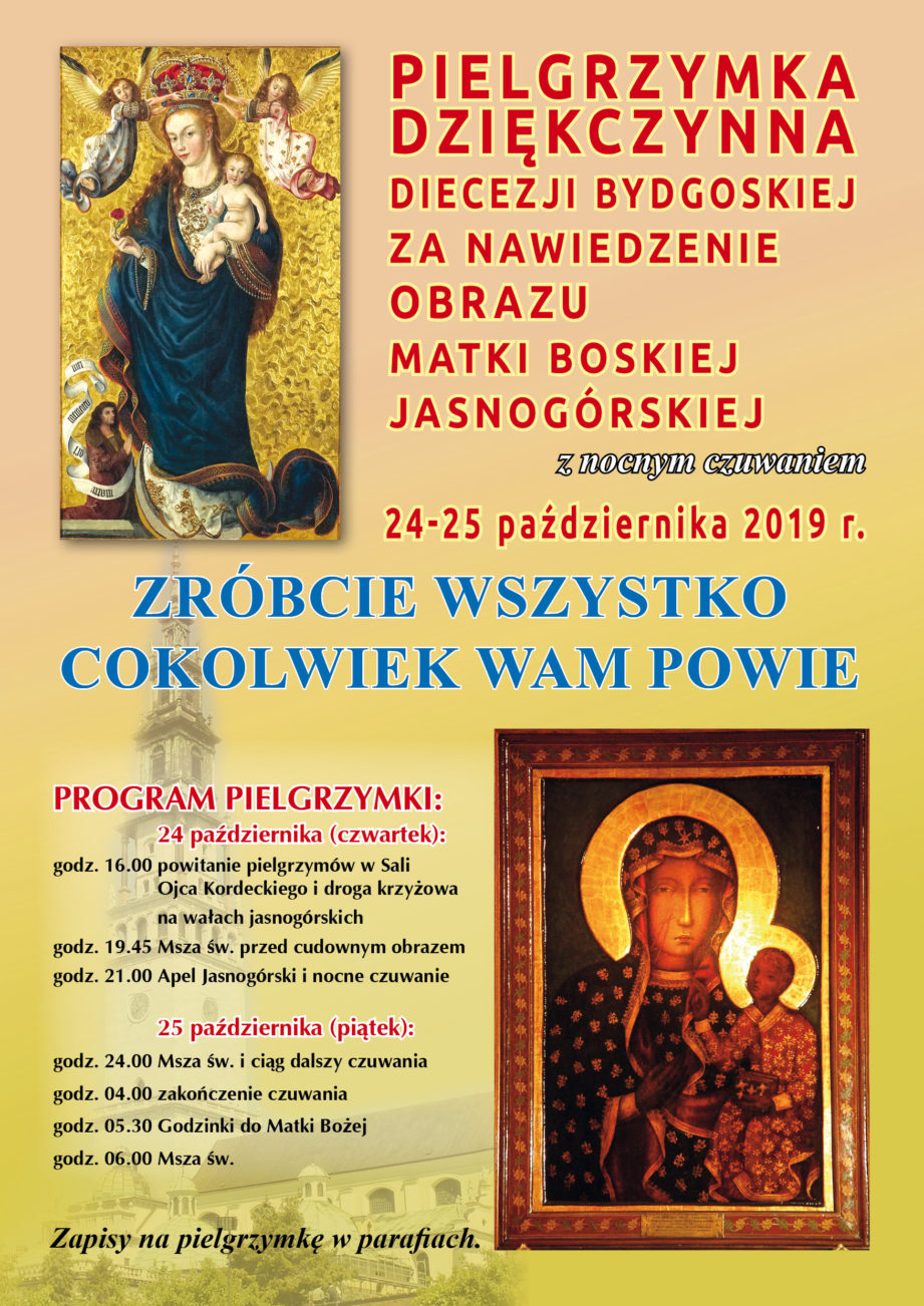 Wiernych diecezji bydgoskiej zapraszamy do udziału w pielgrzymce dziękczynnej na Jasną Górę za nawiedzenie kopii Cudownego Obrazu Matki Bożej Częstochowskiej.