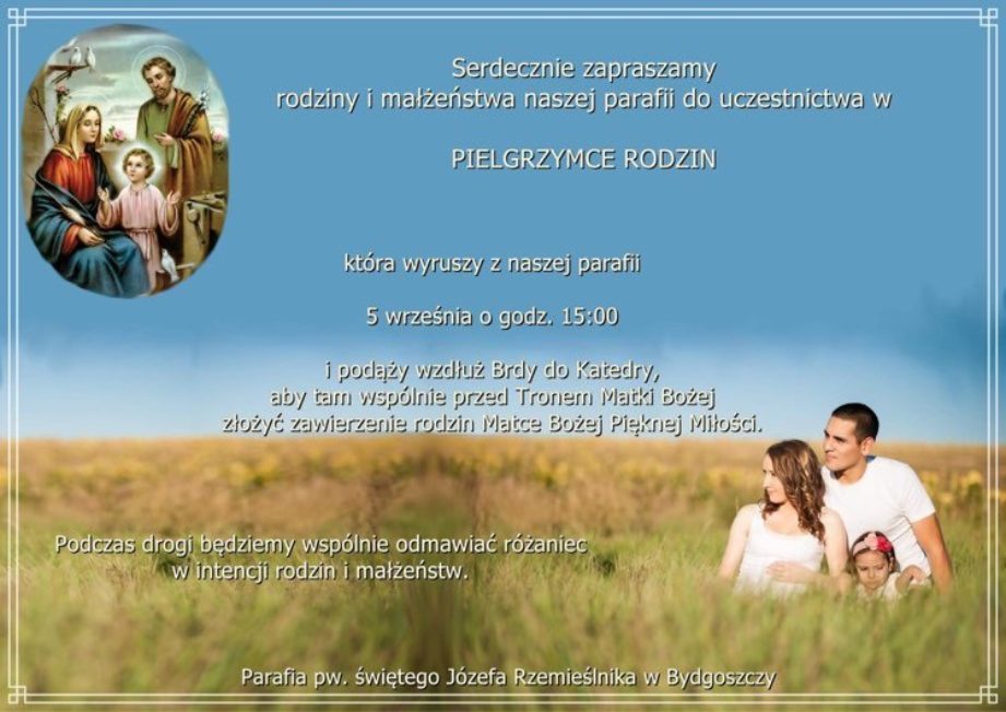 Parafia św. Józefa w Bydgoszczy zaprasza rodziny i małżeństwa do udziału w pieszej pielgrzymce do Katedry św. Marcina i Mikołaja – Sanktuarium Matki Bożej Pięknej Miłości.
