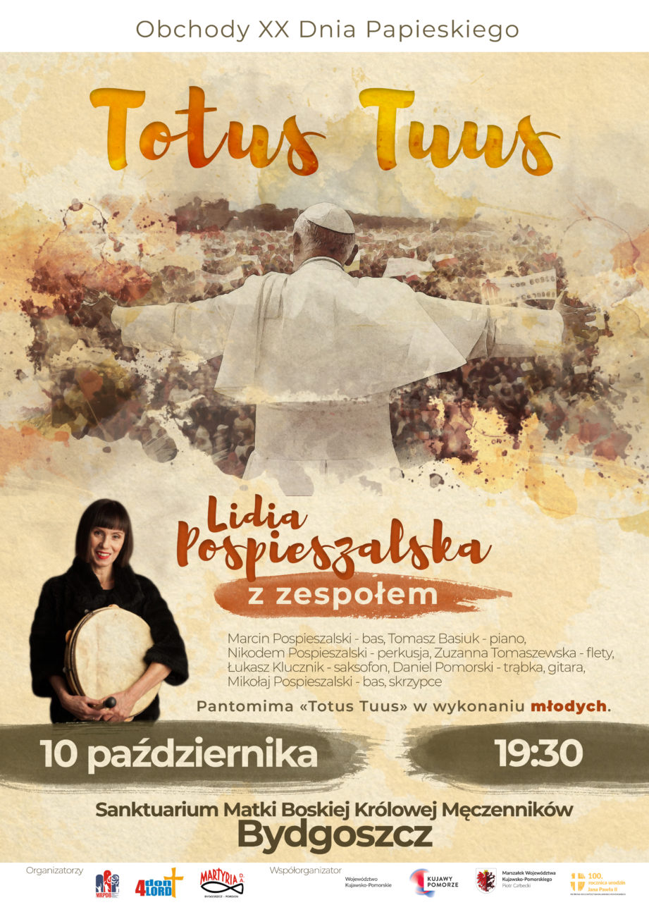 Młodzieżowa Rada Programowa Diecezji Bydgoskiej oraz Diecezjalny Ośrodek Duszpasterstwa Akademickiego „Martyria”, przy współudziale Urzędu Marszałkowskiego Województwa Kujawsko-Pomorskiego, serdecznie zapraszają mieszkańców województwa do przeżycia wyjątkowego koncertu, dedykowanego św. Janowi Pawłowi II w ramach ogólnopolskich obchodów XX Dnia Papieskiego pt. „Totus Tuus” w 100. rocznicę jego urodzin.