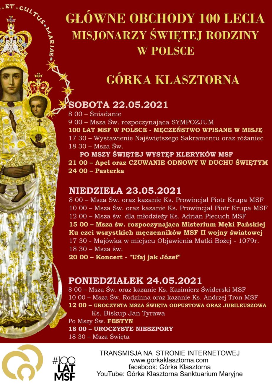 Górka Klasztorna będzie miejscem obchodów 100 rocznicy obecności Misjonarzy Świętej Rodziny w Polsce. Odbędą się one 22, 23 i 24 maja. Szczegóły na PLAKACIE.
