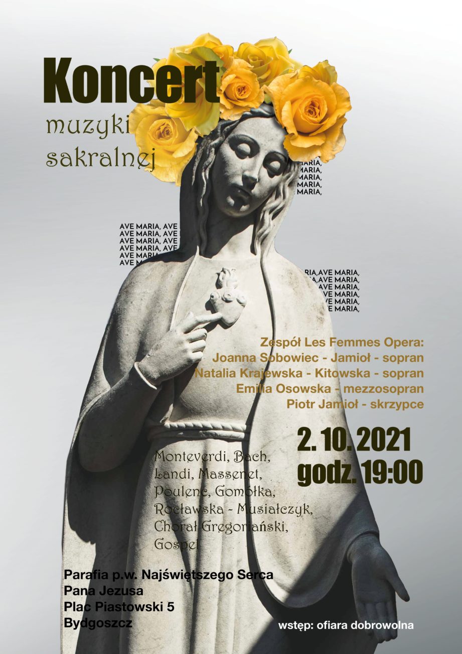 Serdecznie zapraszamy w sobotę, 2 października, o godz. 19:00 do kościoła Najświętszego Serca Pana Jezusa przy pl. Piastowskim w Bydgoszczy na koncert muzyki sakralnej, który pozwoli w wyjątkowy sposób przybliżyć się do serca Maryi.