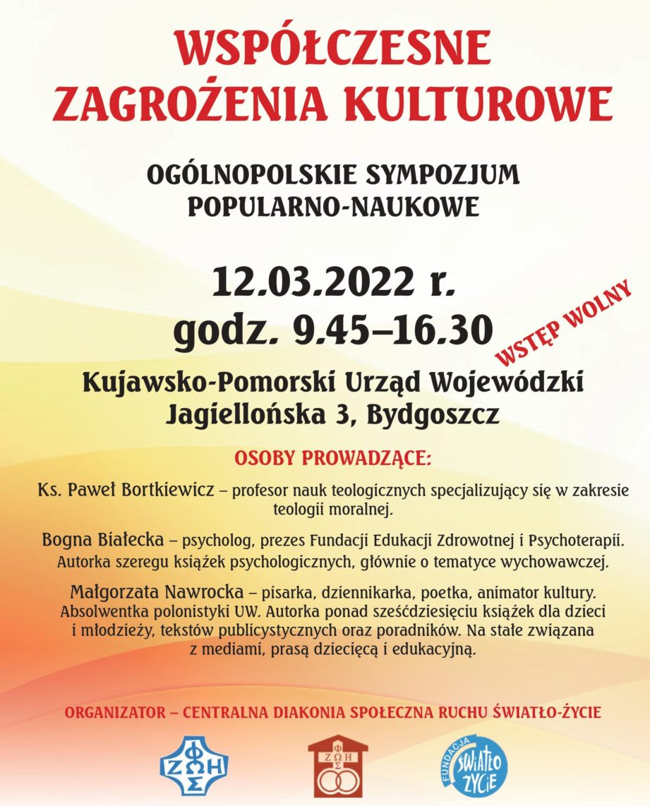 Centralna Diakonia Społeczna Ruchu Światło-Życie zaprasza na ogólnopolskie sympozjum zatytułowane „Współczesne zagrożenia kulturowe”. Odbędzie się ono w sobotę, 12 marca, w Kujawsko-Pomorskim Urzędzie Wojewódzkim w Bydgoszczy.