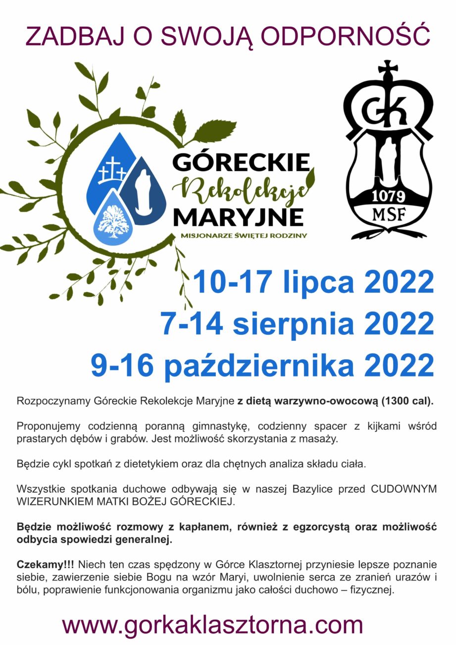 W imieniu Misjonarzy Świętej Rodziny zapraszamy na Góreckie Rekolekcje Maryjne, które odbędą się w Górce Klasztornej.