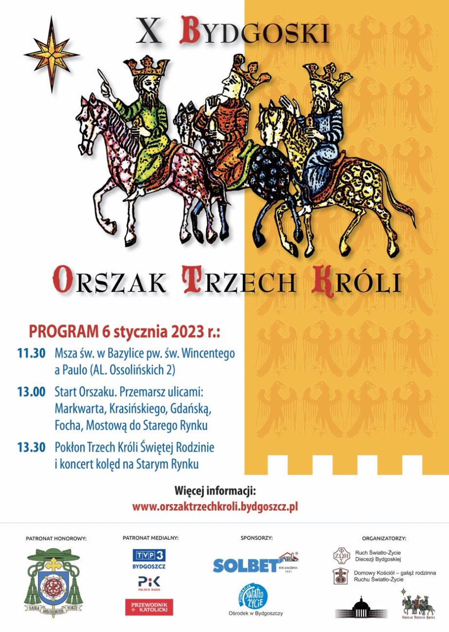 Trwają przygotowania do dziesiątej edycji Bydgoskiego Orszaku Trzech Króli, który 6 stycznia przejdzie ulicami miasta. Trzej królowie, symbolizujący Europę, Azję i Afrykę, podążą za gwiazdą w poszukiwaniu Nowonarodzonego Króla. Przemarsz zakończy się przy stajence, gdzie Kacper, Melchior i Baltazar złożą dary i oddadzą pokłon Dzieciątku Jezus. Przejściu orszaku towarzyszyć będzie wspólne śpiewanie kolęd.