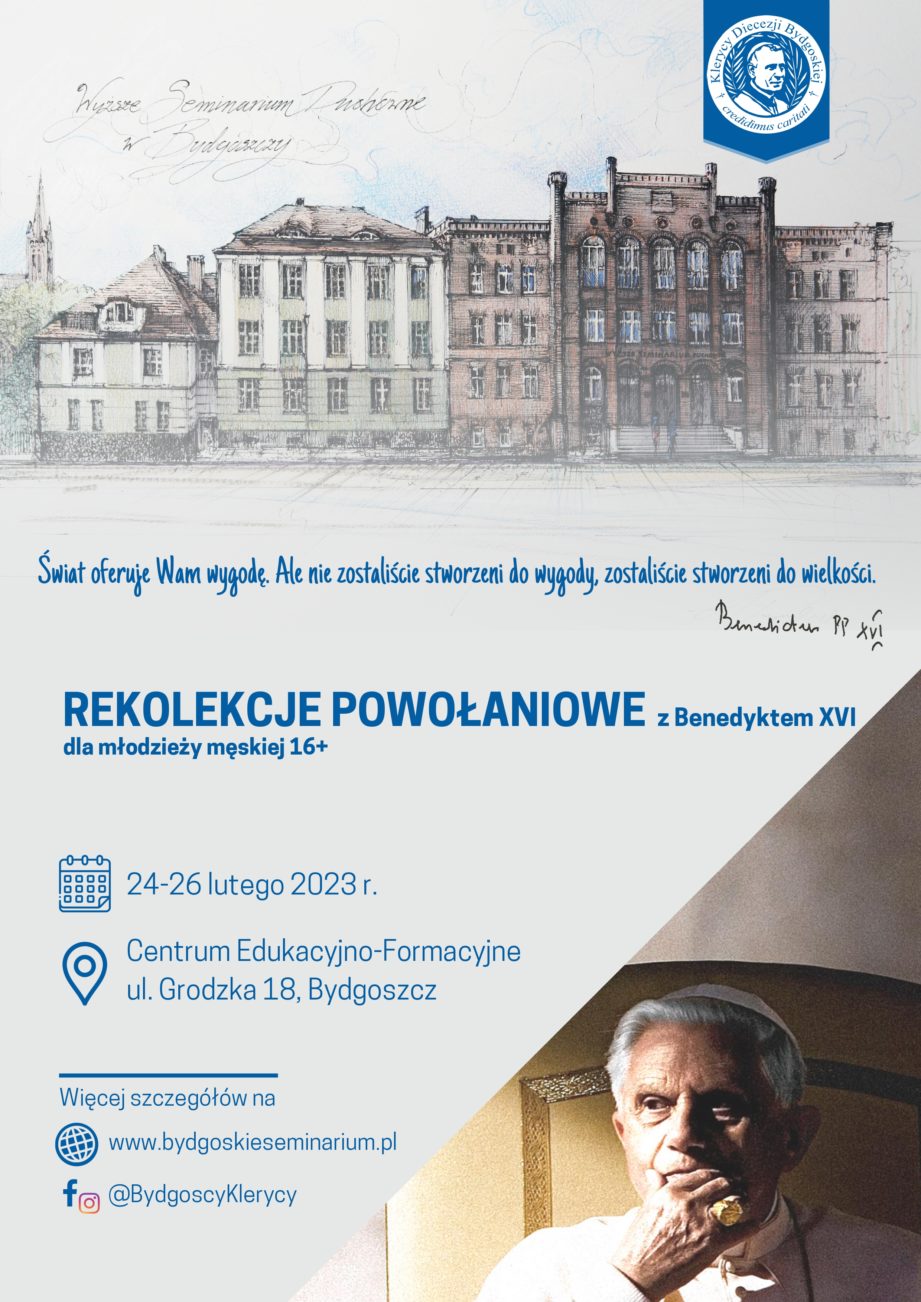 Klerycy diecezji bydgoskiej zapraszają̨ młodzież̇ męską̨ od 16 roku życia na rekolekcje powołaniowe, które odbędą̨ się̨ w gmachu Centrum Edukacyjno-Formacyjnym przy ul. Grodzkiej 18 w Bydgoszczy.