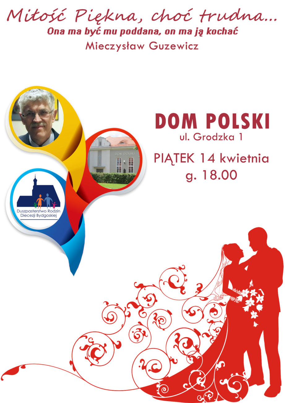 Duszpasterstwo Rodzin Diecezji Bydgoskiej zaprasza w piątek, 14 kwietnia, o godz. 18.00 do Domu Polskiego przy ul. Grodzkiej 1 w Bydgoszczy na prelekcję „Miłość piękna, choć trudna. Ona ma być mu poddana, on ma ją kochać”, którą wygłosi Mieczysław Guzewicz – mąż i ojciec trójki dzieci, doktor habilitowany teologii biblijnej, autor książek, artykułów o tematyce małżeństwa i rodziny.