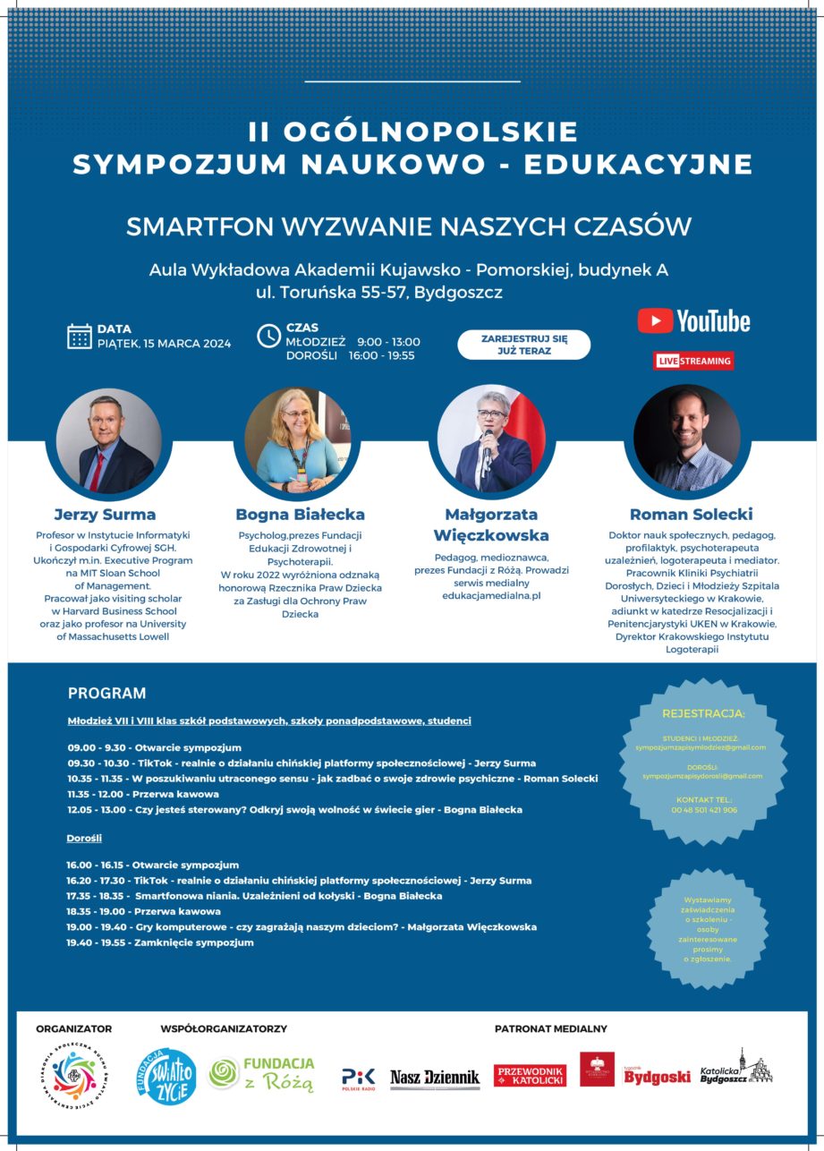 W związku z nasilającym się wśród młodych zjawiskiem fonoholizmu, którego skutkami są zakłócenia rozwoju mowy, problemy z nauką i koncentracją, stres, depresja i narastająca gotowość do stosowania przemocy fizycznej, zapraszamy na drugą edycję ogólnopolskiego sympozjum naukowo-edukacyjnego „Smartfon wyzwanie naszych czasów”.