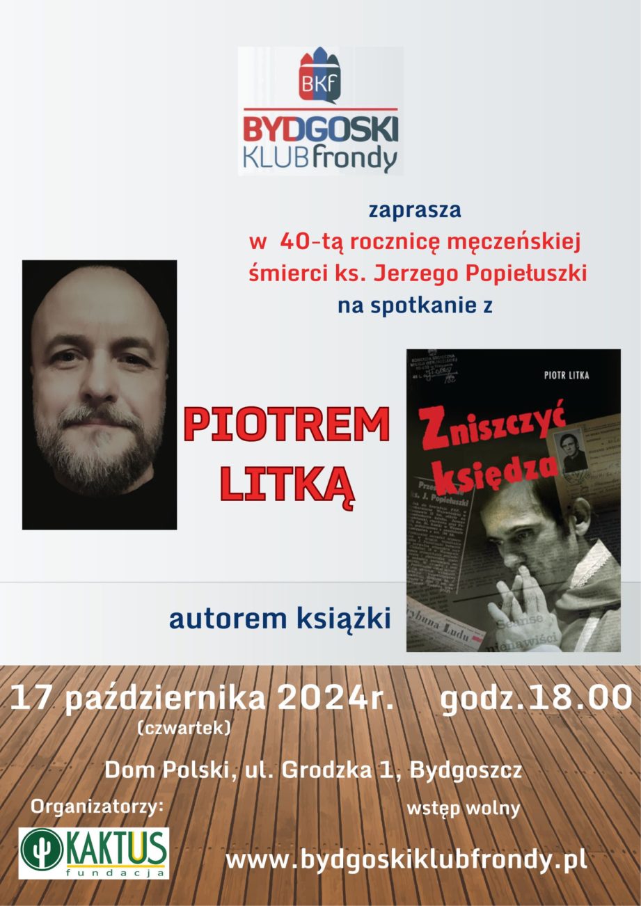 Bydgoski Klub Frondy zaprasza w 40-tą rocznicę męczeńskiej śmierci ks. Jerzego Popiełuszki, na spotkanie z dziennikarzem, reporterem i reżyserem filmów dokumentalnych – Piotrem Litką – autorem książki pt : „ZNISZCZYĆ KSIĘDZA”.