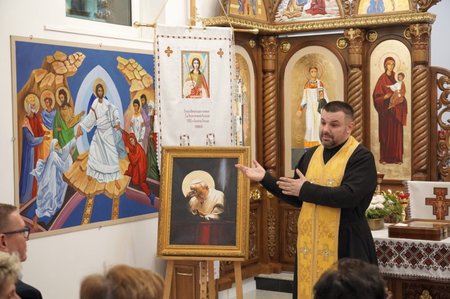 Proboszcz greckokatolickiej wspólnoty nawiązał m.in. do słów Ojca Świętego, jakie ten wypowiedział w Gnieźnie. „Czyż Chrystus tego nie chce, czy Duch Święty tego nie rozrządza, ażeby ten papież Polak, papież Słowianin, odsłonił duchową jedność chrześcijańskiej Europy, na którą składają się dwie wielkie tradycje: Zachodu i Wschodu”. – To obraz, który pisze nową historię tego miejsca, niesie przesłanie potrzebne każdemu z nas. Jestem szczęśliwy, że św. Jan Paweł II jest wciąż z nami, wstawia się za całym światem. Czyta, spogląda – mówił ks. Roman Narytnyk.