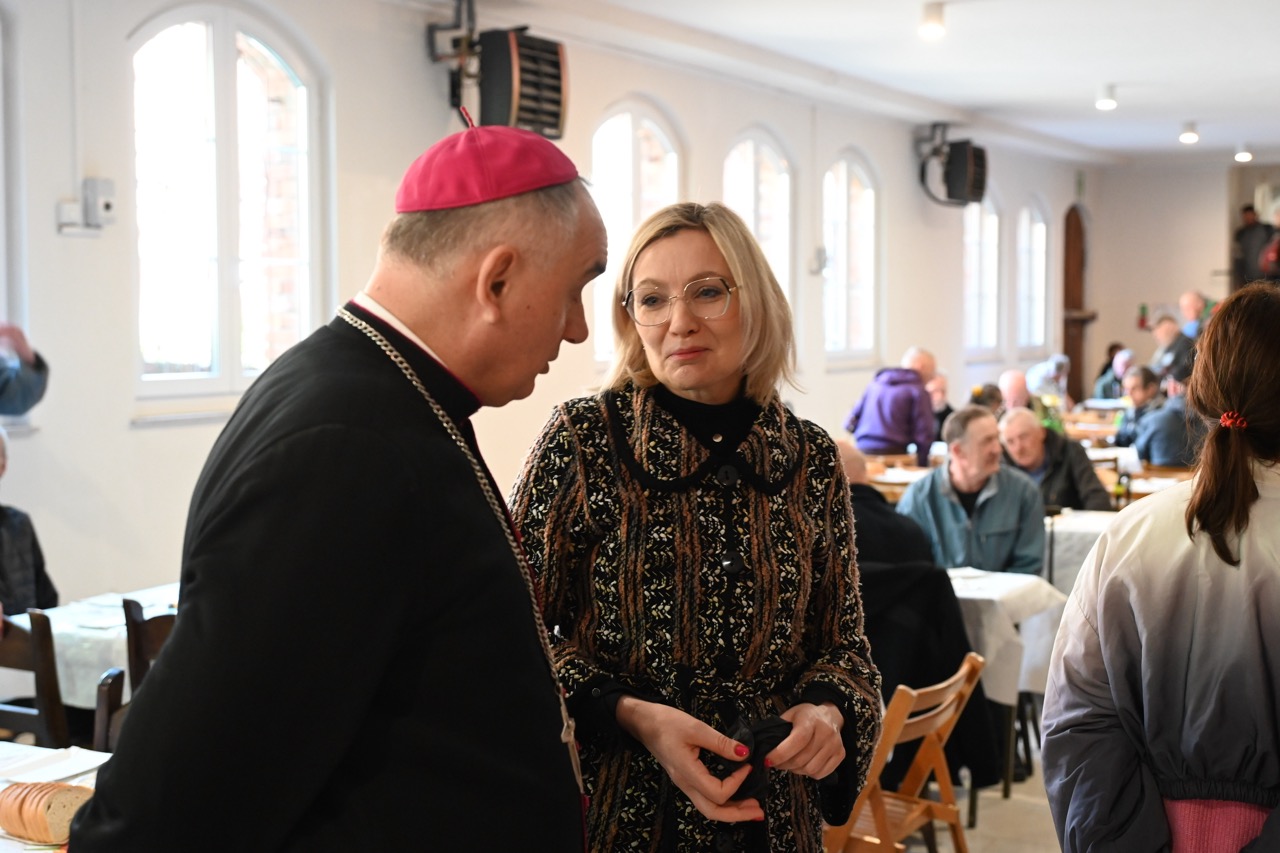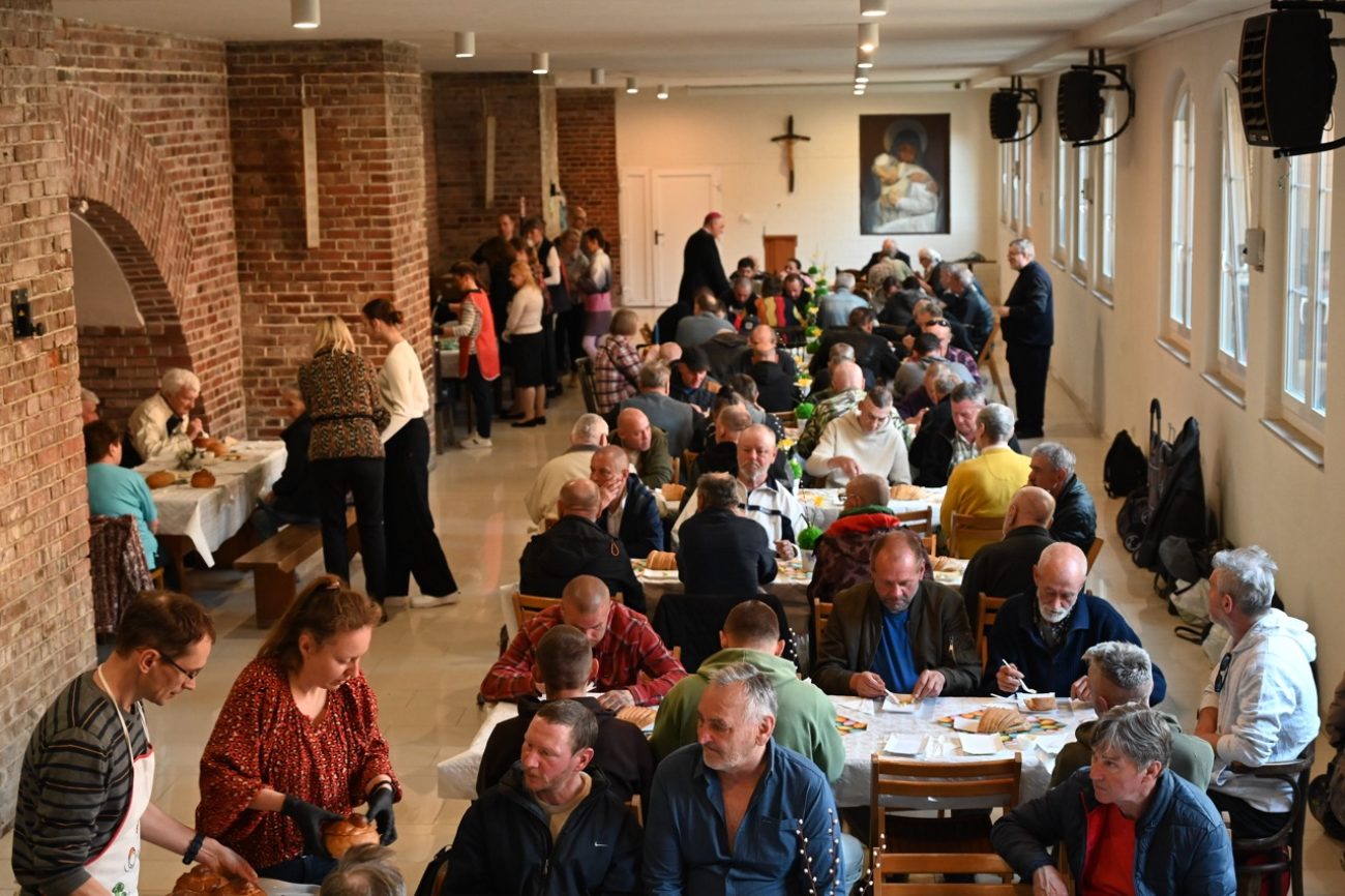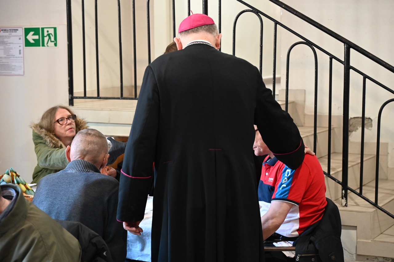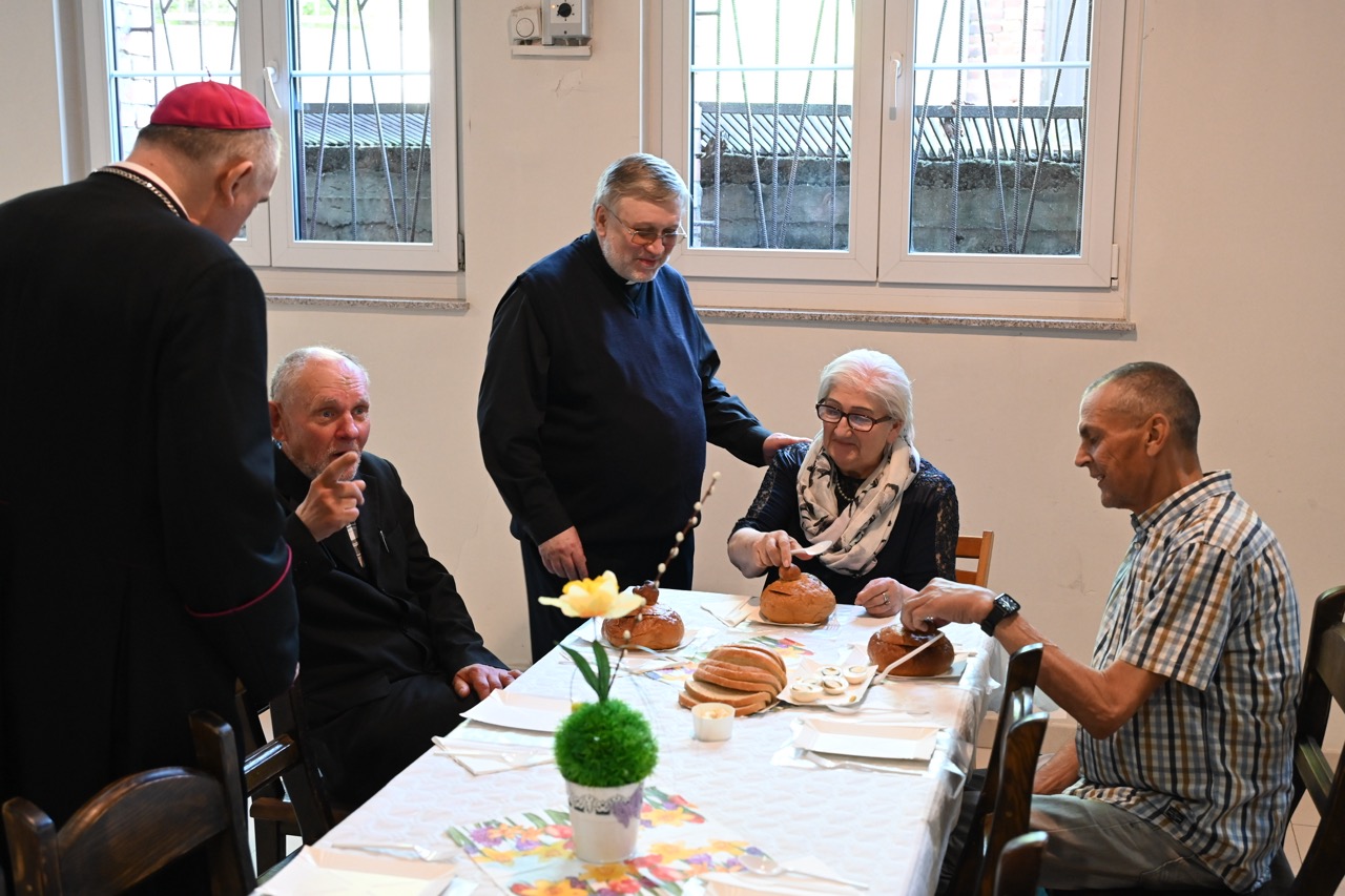 Posiłek został poprzedzony błogosławieństwem pokarmów. Tradycyjnie w menu pojawił się żurek z jajkiem. Była także biała kiełbasa. – Dziękuję za otwarte serce, drzwi i przyjęcie nas w tym miejscu. Jesteśmy jedną, rodziną, przyjaciółmi Jezusa. Tego, który potwierdził miłość do każdego z nas, dając przybić się do krzyża. Umarł, ale żyje i jest wciąż z nami – powiedział bp Krzysztof Włodarczyk.