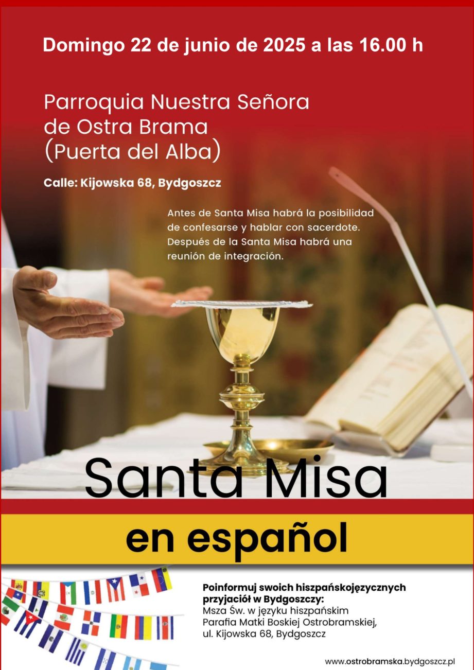 Proboszcz parafii Matki Boskiej Ostrobramskiej w Bydgoszczy – ks. dr Rafał Grabowski – zaprasza na Mszę św. w języku hiszpańskim.
