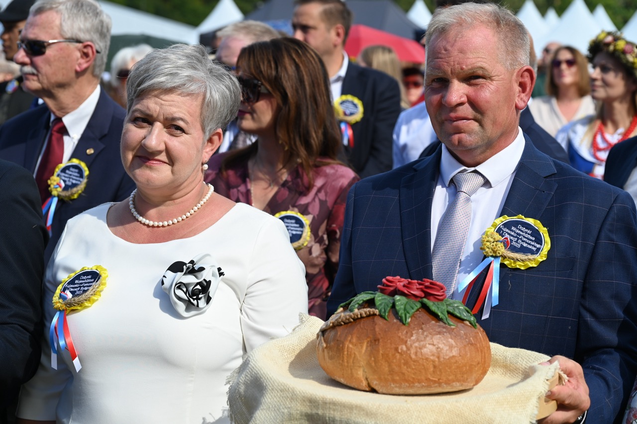 „To niezwykle ważne, by dożynki miały podwójny wymiar: duchowy, kiedy dziękujemy Bogu, i ten ludzki” – mówił marszałek Piotr Całbecki. – Kiedy dziękujemy tym, dzięki którym codziennie mamy na naszych stołach świeży, pachnący chleb. Musimy pamiętać, jakim wysiłkiem i wyrzeczeniami ten chleb jest opłacony – dodał marszałek województwa, dziękując rolnikom. – Niech nasze rolnictwo się rozwija. Niech zasiewy, które już się rozpoczęły, przyniosą w przyszłym roku spodziewane wysokie plony, dobrobyt, radość i szczęście na naszej kujawsko-pomorskiej wsi. Szczęść Boże! – dodał Piotr Całbecki.