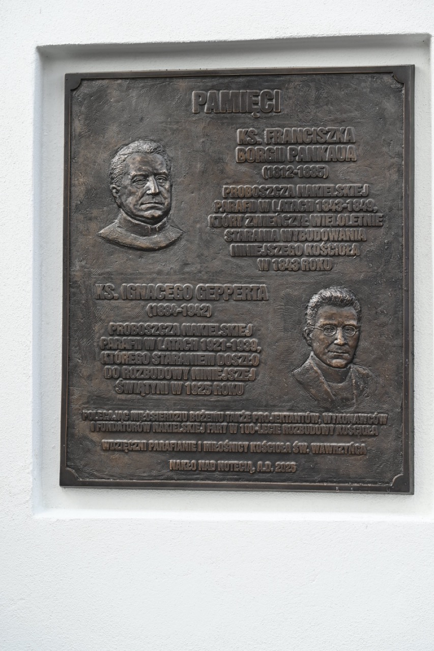 Zwieńczeniem uroczystości było odsłonięcie oraz poświęcenie tablicy, jaka upamiętnia: ks. Franciszka Borgii Pankaua, proboszcza nakielskiej parafii w latach 1843-1849, który zwieńczył wieloletnie starania wybudowania niniejszego kościoła i ks. Ignacego Gepperta, proboszcza wspólnoty w latach 1921-1939, którego staraniem doszło do rozbudowy świątyni w 1925 roku. Wspominano także innych proboszczów, m.in. ks. Ignacego Klimackiego, ks. Edwarda Wosika, ks. Jana Andrzejczaka i obecnego na obchodach 100-lecia – ks. prałata Grzegorza Nowaka, obecnego kanclerza kurii.