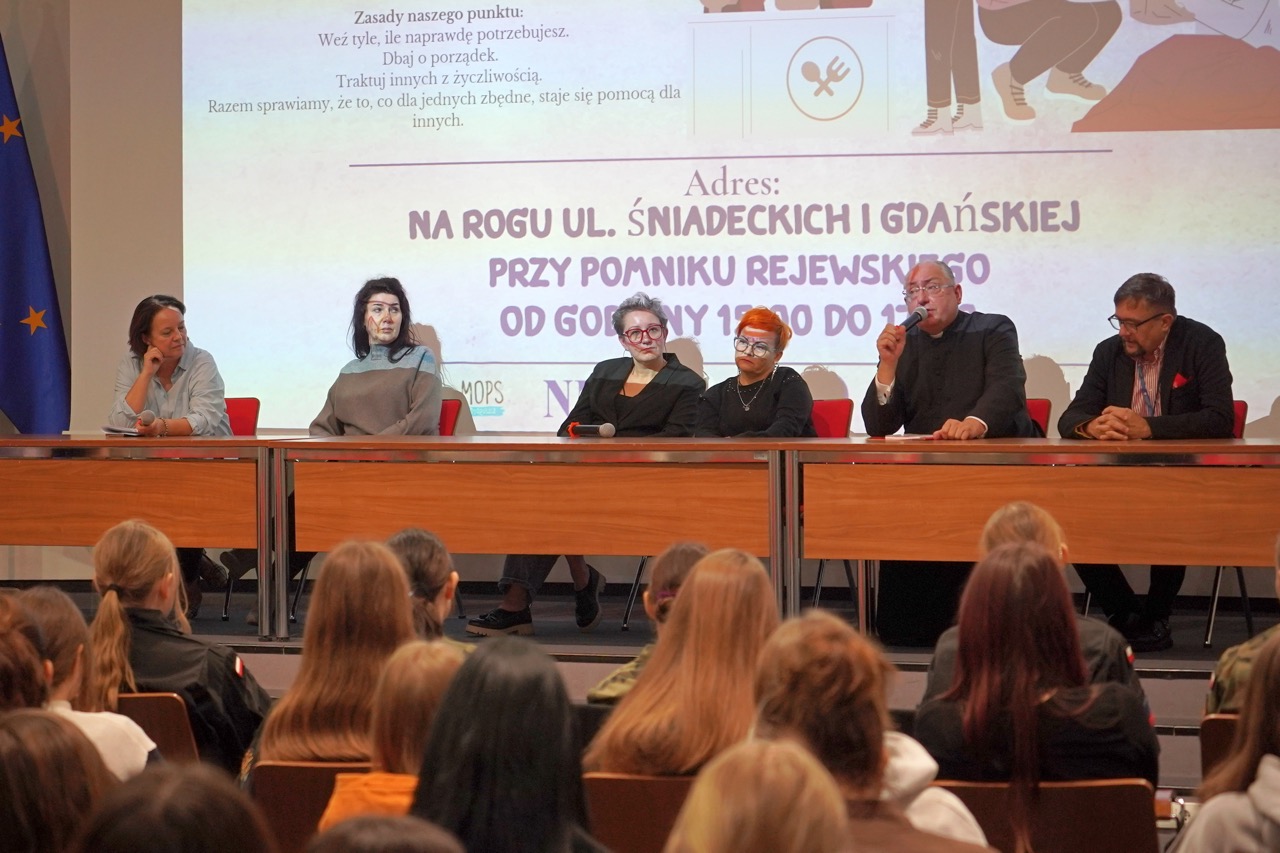Zwracając się do uczniów, zachęcała, by mieli wokół siebie przyjaciół, na których zawsze będą mogli liczyć. – Jestem przykuta do wózka, ale nie potrafię usiedzieć w jednym miejscu. Choroba również nie oznacza, że mogę nic nie robić – dodała. – Na pewno zgubą są nałogi, na które młodzież jest podatna. Przez to się stacza, a potem przegrywa. Jest dużo ludzi, którzy do tego doprowadzają. Są tak zwanymi przyjaciółmi, ale tylko na chwilę, na dziś. Trzeba na to uważać – dodał Jerzy Żurawik. – Świadectwa, jakie usłyszeliśmy, pokazują, że może być to problem każdego z nas – stwierdził Ireneusz Nitkiewicz, wskazując m.in. na chorobę. – Z mojej perspektywy ubóstwo należy kojarzyć przede wszystkim z samotnością. Ja na co dzień pracuję z osobami w kryzysie bezdomności i jest to według mnie problem niepoliczalny. Tam ubóstwo jest wszechobecne. To jest niezwykle ważne, by młodych edukować. Uświadamiać, że zarówno osoba uboga czy bezdomna to nie ktoś, kto może komukolwiek zagrozić. To nie osoba, od której należy odwrócić wzrok. To osoba, do jakiej należy wyciągać rękę, bo bardzo często jej oraz naszego głosu potrzebuje – mówi Emilia Chaberska, która jest pracownikiem socjalnym Miejskiego Ośrodka Pomocy Społecznej w Bydgoszczy.