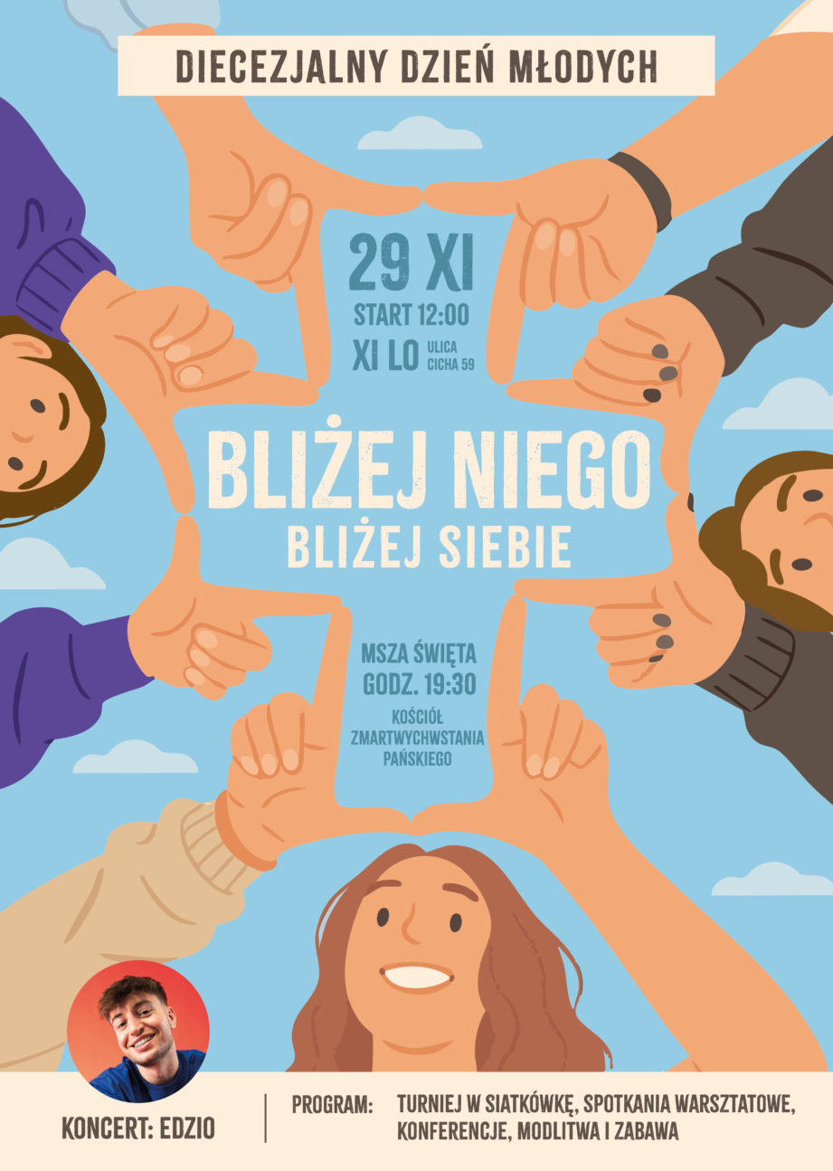 W sobotę, 29 listopada, zapraszamy młodych z całej diecezji na wyjątkowe święto wiary, wspólnoty i radości – Diecezjalny Dzień Młodych, który w tym roku odbędzie się pod hasłem „Bliżej Niego, bliżej siebie”. Zaproszenie kierujemy do młodych w każdym wieku – tych, którzy już aktywnie działają w parafiach, jak i tych, co dopiero szukają swojego miejsca.