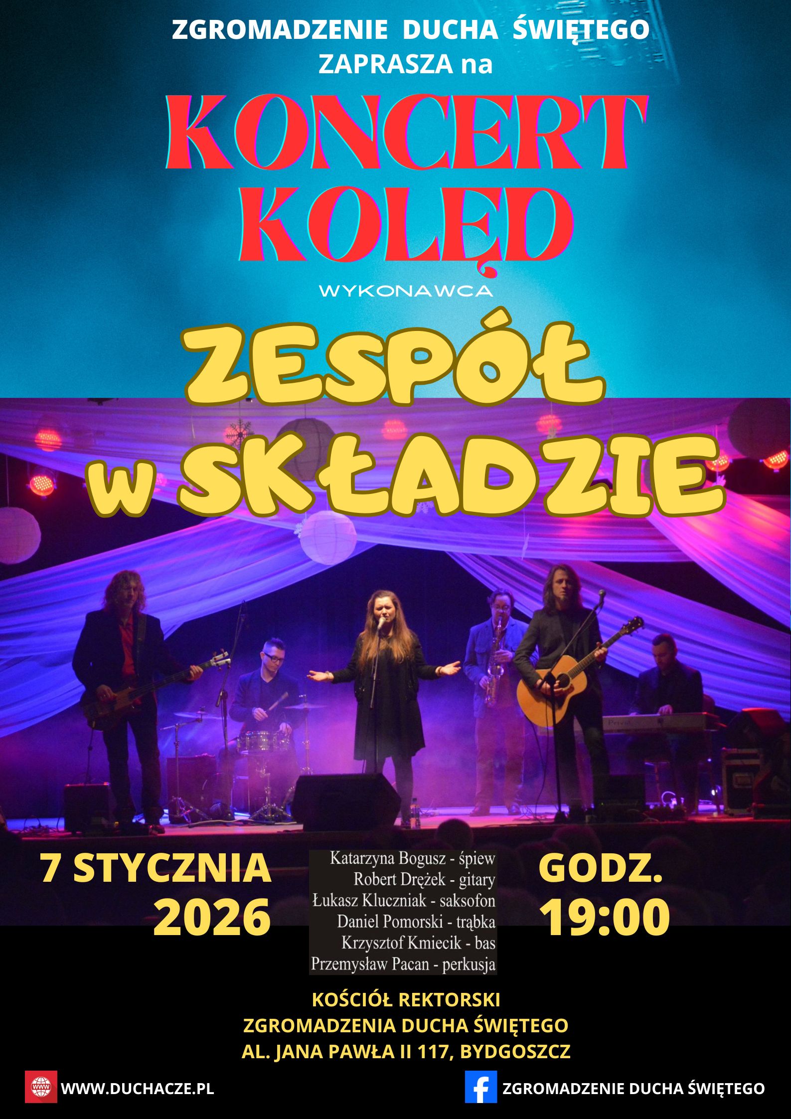Natomiast w środę, 7 stycznia, zapraszamy również do kościoła rektorskiego na wyjątkowe wydarzenie muzyczne: koncert kolęd w wykonaniu „Zespołu w Składzie”. Stworzyli go profesjonalni muzycy, którzy na co dzień grają w znanych zespołach muzycznych (m.in. Arka Noego, Luxtorpeda, 2Tm 2,3). Koncert rozpocznie się o godz. 19.00.