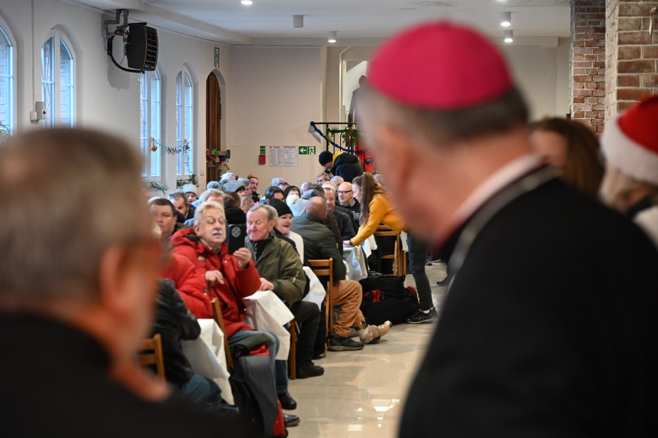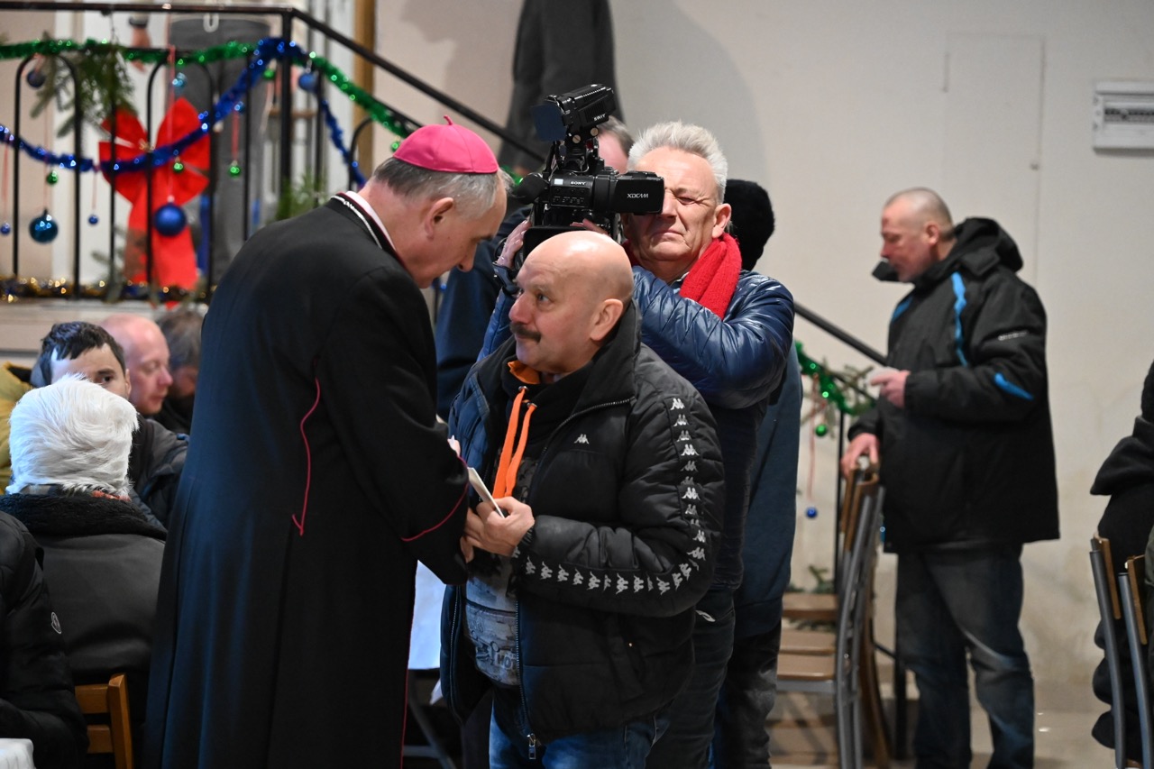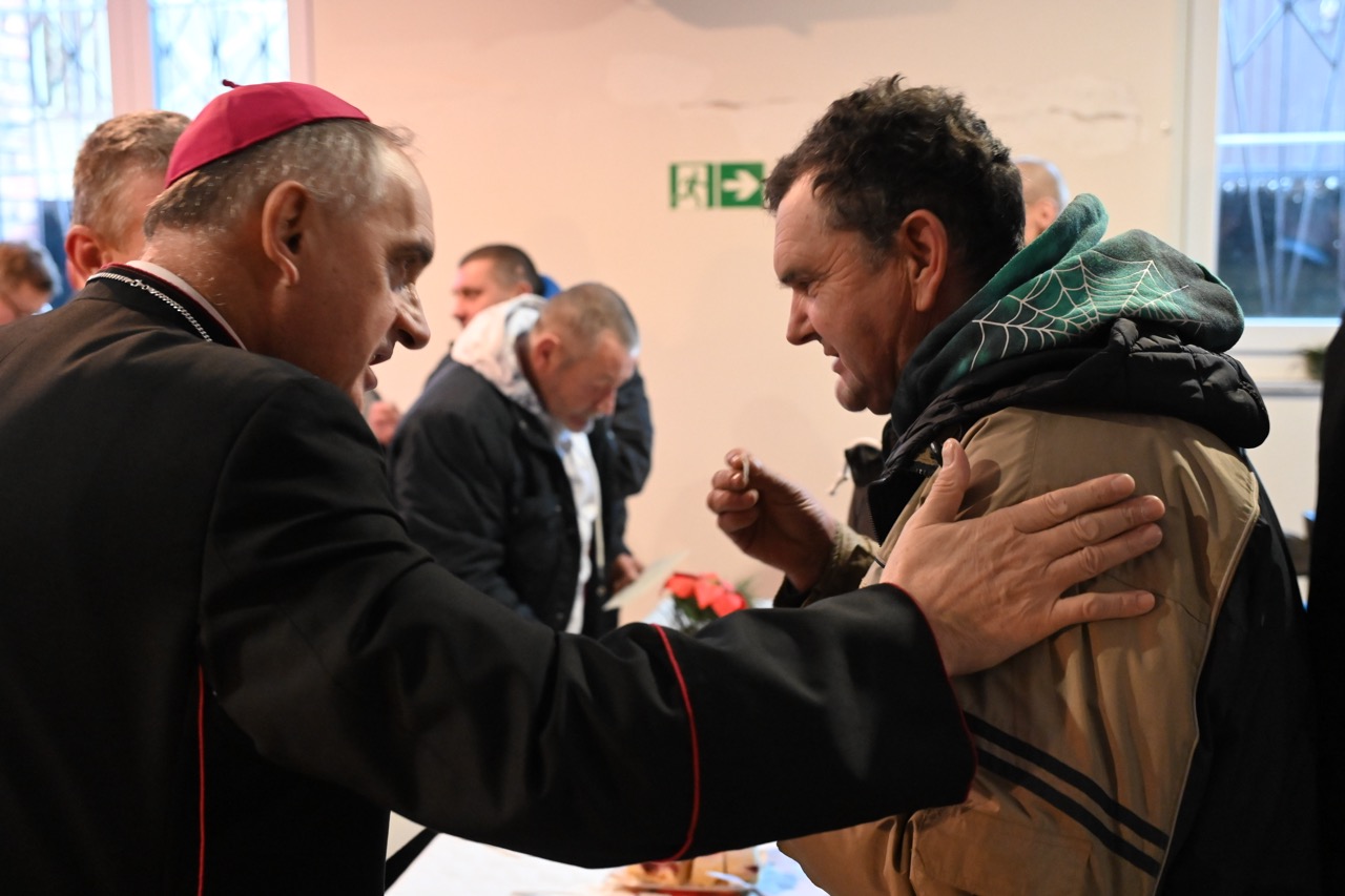 „Dziękuję ojcom, wolontariuszom, którzy będą wam służyli, by przeżyć piękne spotkanie. Pozdrawiam was w duchu miłości, którą przyniósł Pan Jezus” – mówił bp Krzysztof Włodarczyk, który zasiadł przy jednym ze stołów, słuchając uważnie kilku historii osób będących w kryzysie bezdomności.