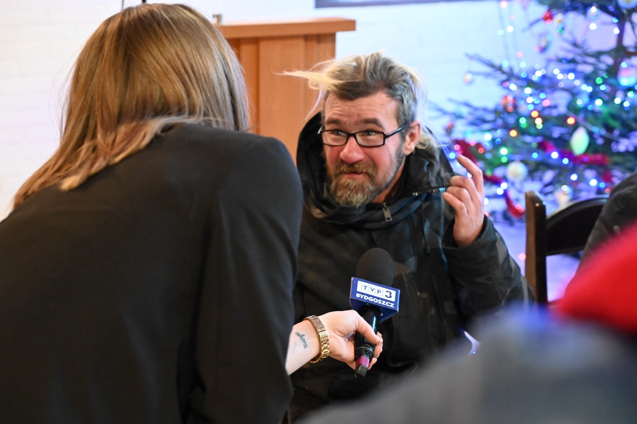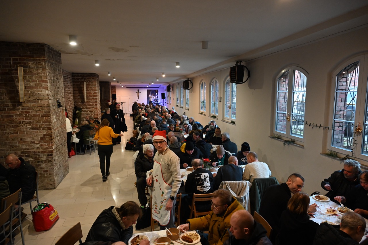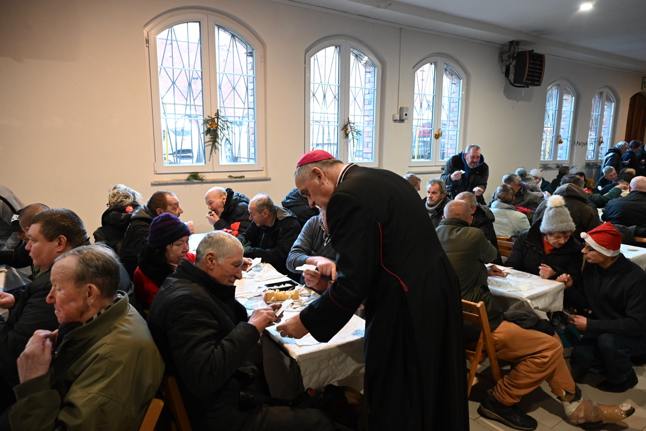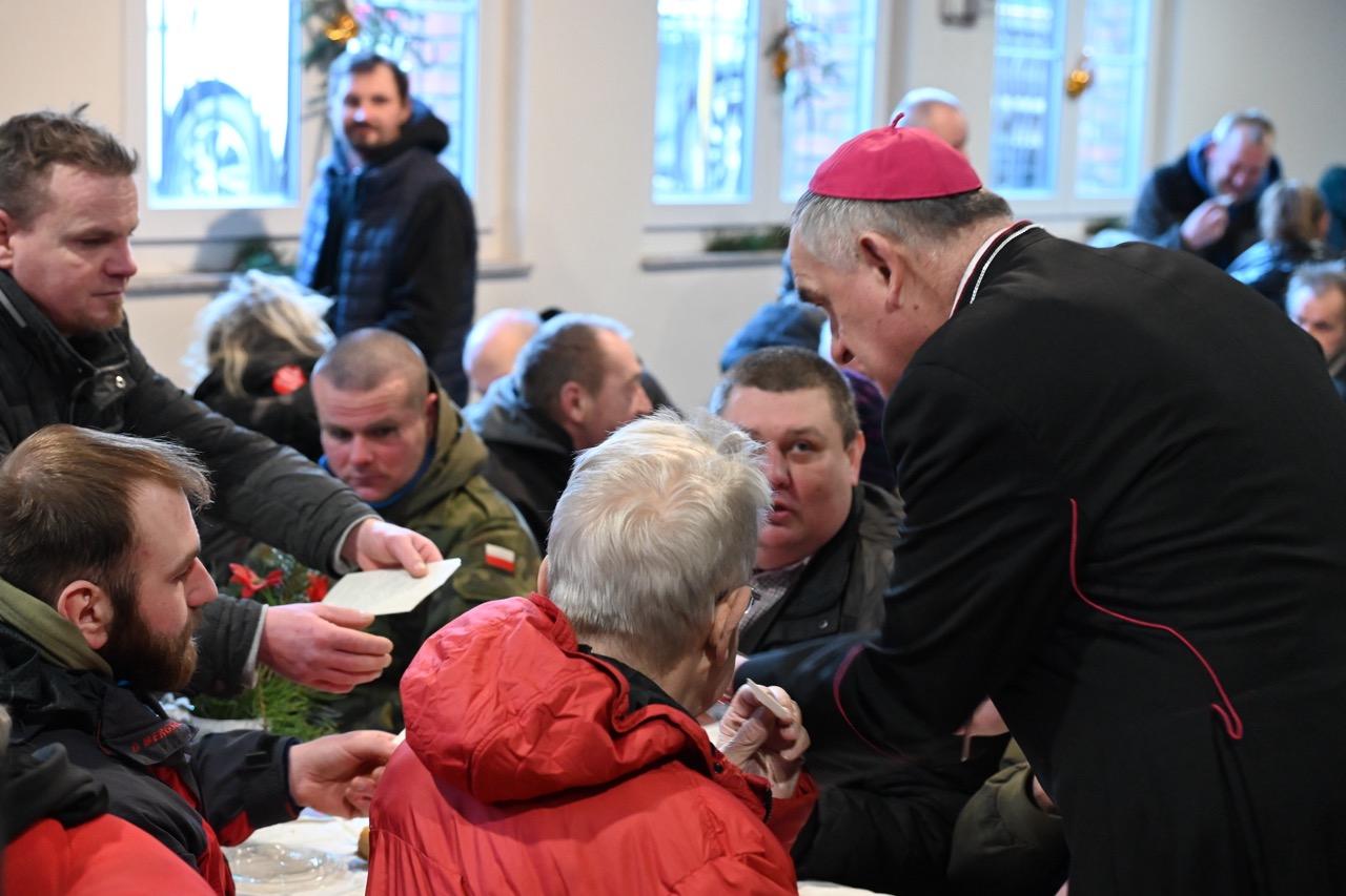 „Dziękuję ojcom, wolontariuszom, którzy będą wam służyli, by przeżyć piękne spotkanie. Pozdrawiam was w duchu miłości, którą przyniósł Pan Jezus” – mówił bp Krzysztof Włodarczyk, który zasiadł przy jednym ze stołów, słuchając uważnie kilku historii osób będących w kryzysie bezdomności.