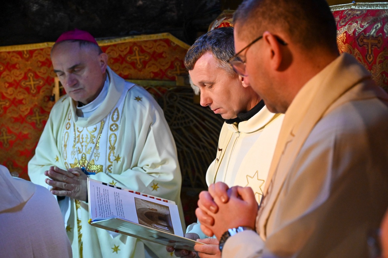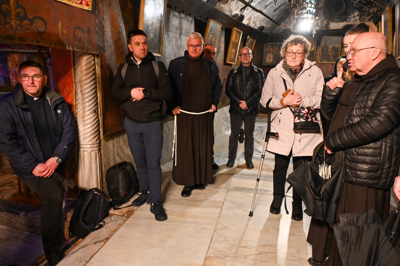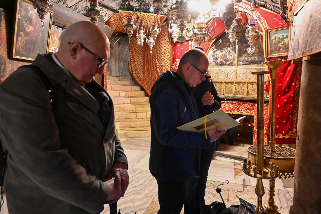 W Bazylice Narodzenia Pańskiego modliła się grupa pielgrzymów z diecezji bydgoskiej. – Stoimy w miejscu, gdzie „Słowo stało się ciałem i zamieszkało między nami”. W tej grocie Bóg wszedł w historię człowieka nie z mocą pałaców, lecz w ciszy, ubóstwie i pokorze. Tak spełniła się zapowiedź proroka Izajasza: „Naród kroczący w ciemnościach ujrzał światłość wielką”. Tą światłością jest Dziecko z Betlejem – Bóg bliski, Emmanuel – mówił ks. Krzysztof Kozłowski, który wygłosił homilię.