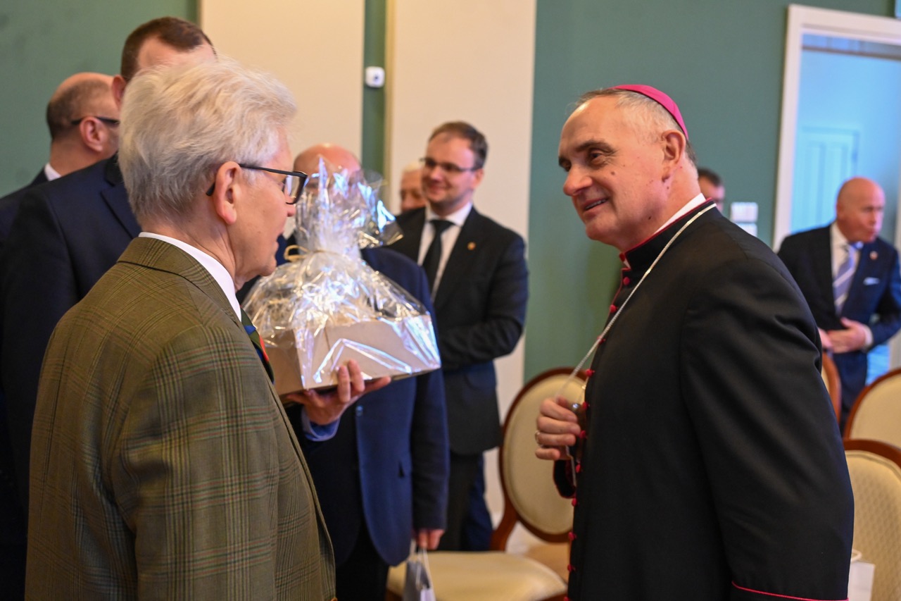 Według wicewojewody wielkopolskiego czas obchodów Bożego Narodzenia i świętowania Nowego Roku nie powinien ograniczać się tylko do wspominania tradycji. – Ten rodzący się maleńki Pan Jezus, owinięty w pieluszki, położony w żłobie, to cząstka nagiej prawdy, która dzisiaj tak często bywa zakłamywana, przeinaczana. Chociaż prawda zwycięży i zawsze się przebije, to zauważmy, jak ten otaczający świat potrafi dzisiaj ją niszczyć, wykorzystywać i nie w tym świetle stawiać, w jakim być powinna. Więc cieszymy się, że przychodząc tutaj możemy skorzystać z tego duchowego wsparcia. Z tego, że tutaj znajdziemy ten element odwzorowania dla tej małej, nagiej prawdy, rodzącej się w sercu każdego z nas – dodał Jarosław Maciejewski. – Pragnę podziękować księdzu biskupowi za niezwykle ważne, integrujące spotkanie. Mocno wybrzmiało, że żyjemy w trudnym czasie. Jako samorządowcy w szczególny sposób odczuwamy niepokój naszych mieszkańców o pokój, który jest zagrożony. Tak, jak zagrożony jest świat pewnych wartości, utrwalony przez dziesięciolecia – dodał członek zarządu województwa kujawsko-pomorskiego – Marek Wojtkowski.