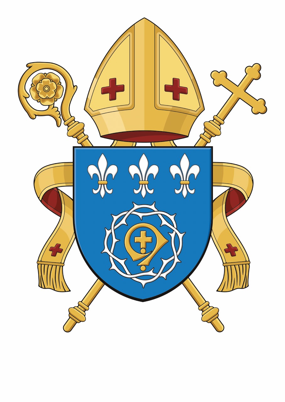 U góry nad tarczą widnieje złota infuła z opadającymi na boki dwiema taśmami. Opcjonalnie w dolnej części pastorału i krzyża, umieszczono srebrzystą banderolę z końcami zawiniętymi wokół trzonów, z podpisem diecezji.