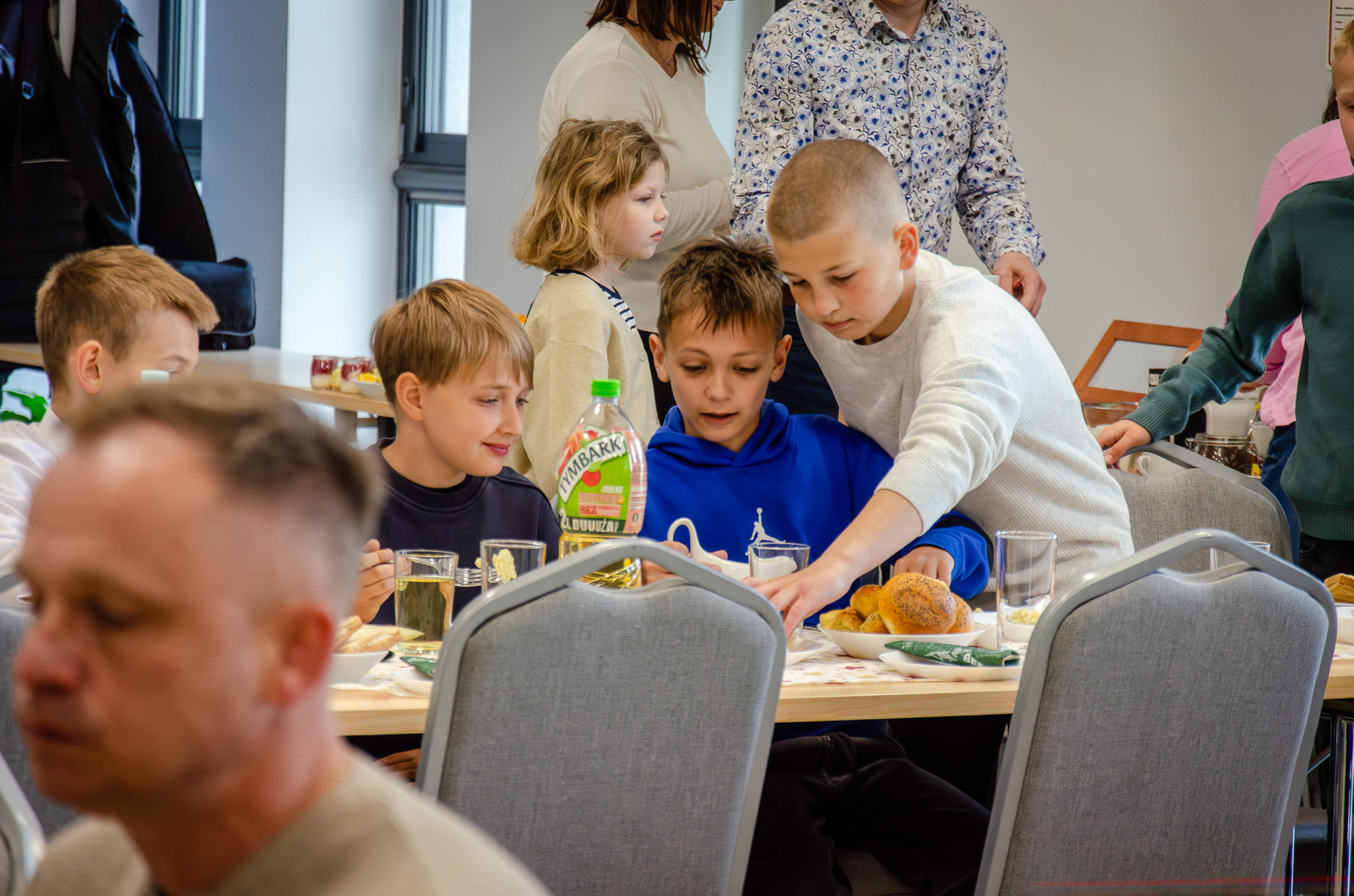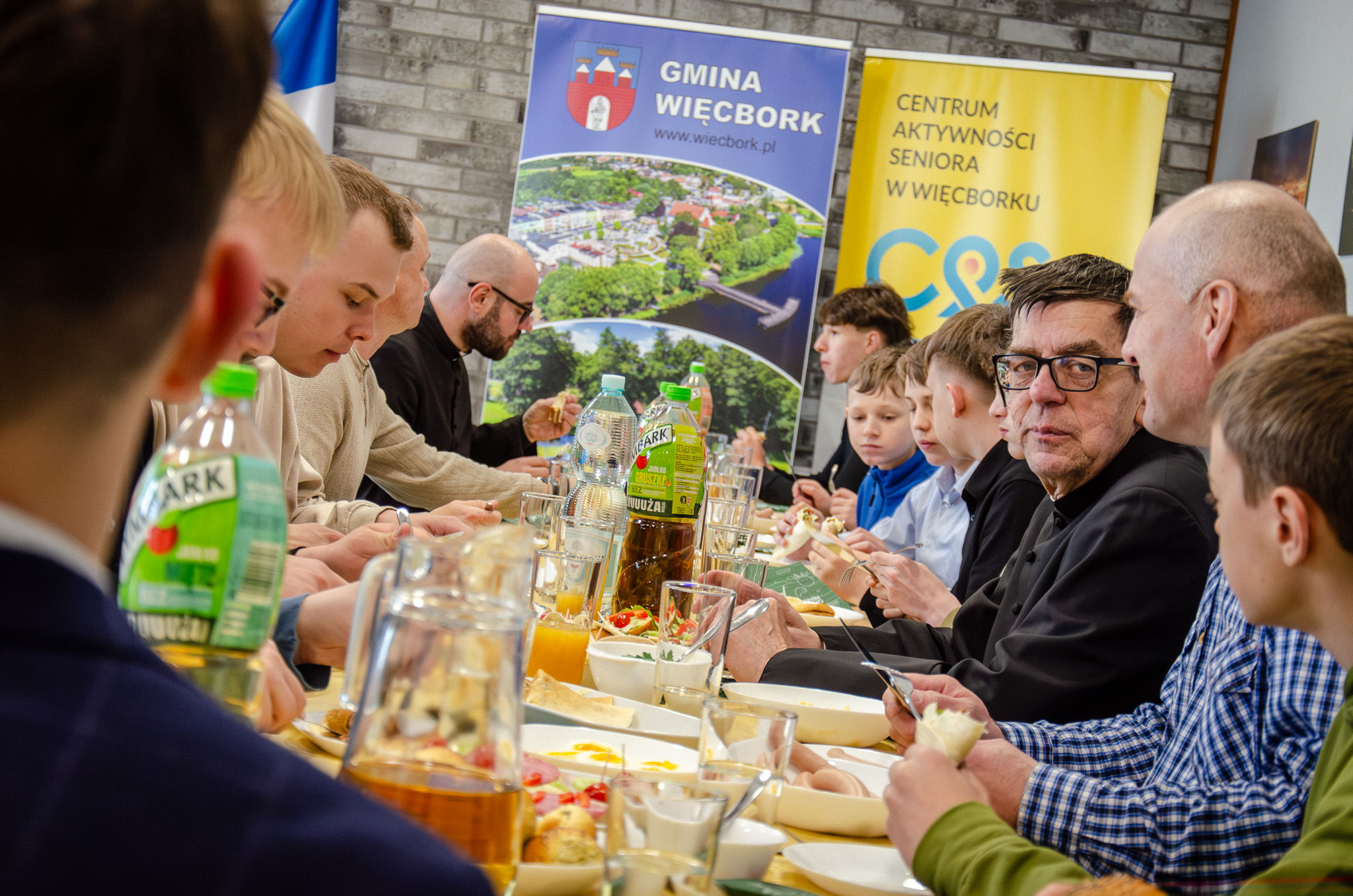 Następnie uczestnicy spotkali się w Centrum Aktywności Seniora w Więcborku, gdzie rodzice więcborskich ministrantów przygotowali poczęstunek w formie drugiego śniadania. Wspólne spotkanie przy stole stało się okazją do rozmów, integracji oraz dzielenia się radością przeżytego dnia.