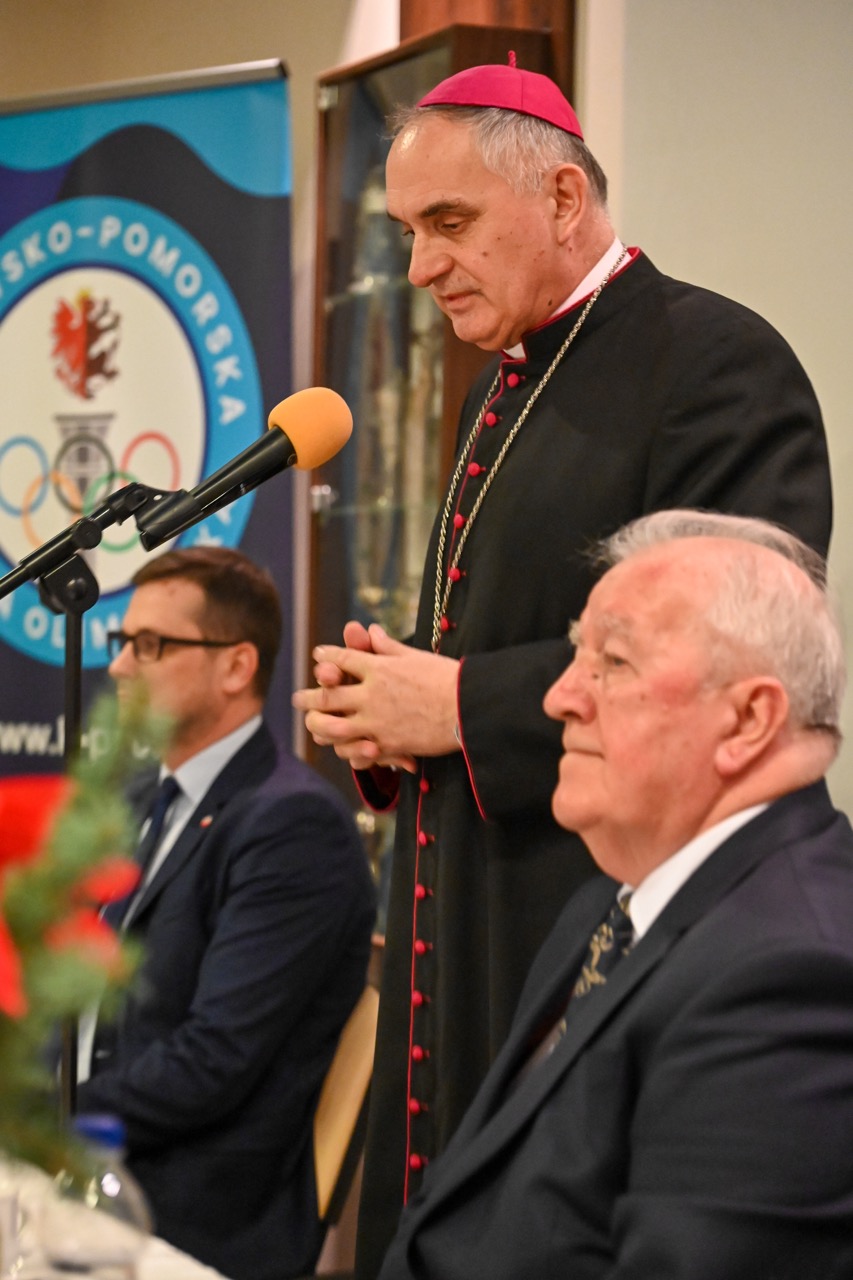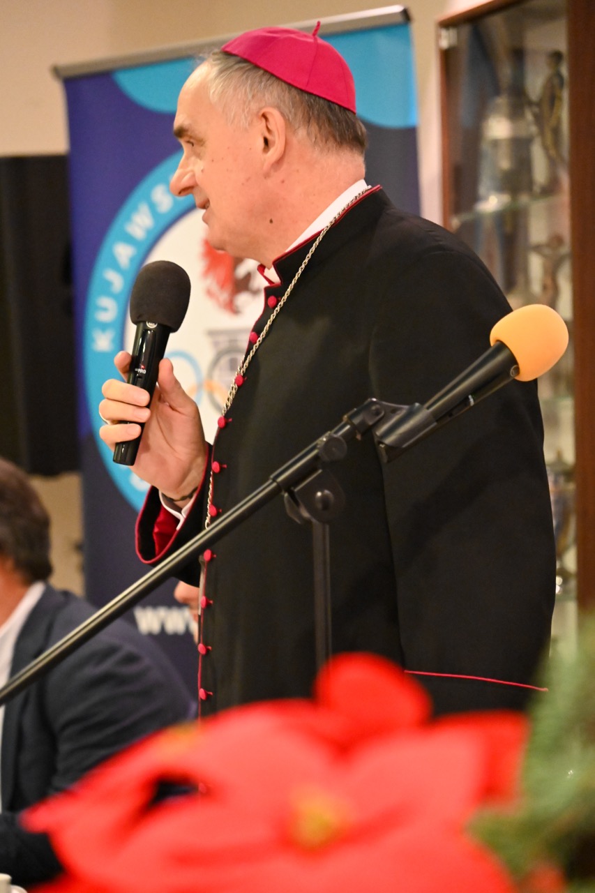Do uczestników spotkania zwrócił się także biskup bydgoski. – Cieszę się, że mogę zadebiutować w tym miejscu i okolicznościach świąt Narodzenia Pańskiego. Bóg przyszedł do nas jako człowiek, dziecko, urodził się w Betlejem, w stajence i to wspominamy. Zapisane to zostało w Ewangeliach. Na to, czy wierzymy w Jezusa Chrystusa, który jest i żyje, odpowiadamy wiarą. Życzę doświadczenia bliskości Boga, a przez to, otwarcia i zbliżania się do siebie. Entuzjazmu, radości, widzenia tego horyzontu w życiu. Niech Bóg będzie blisko w państwa działaniach i poczynaniach sportowych – powiedział bp Krzysztof Włodarczyk.